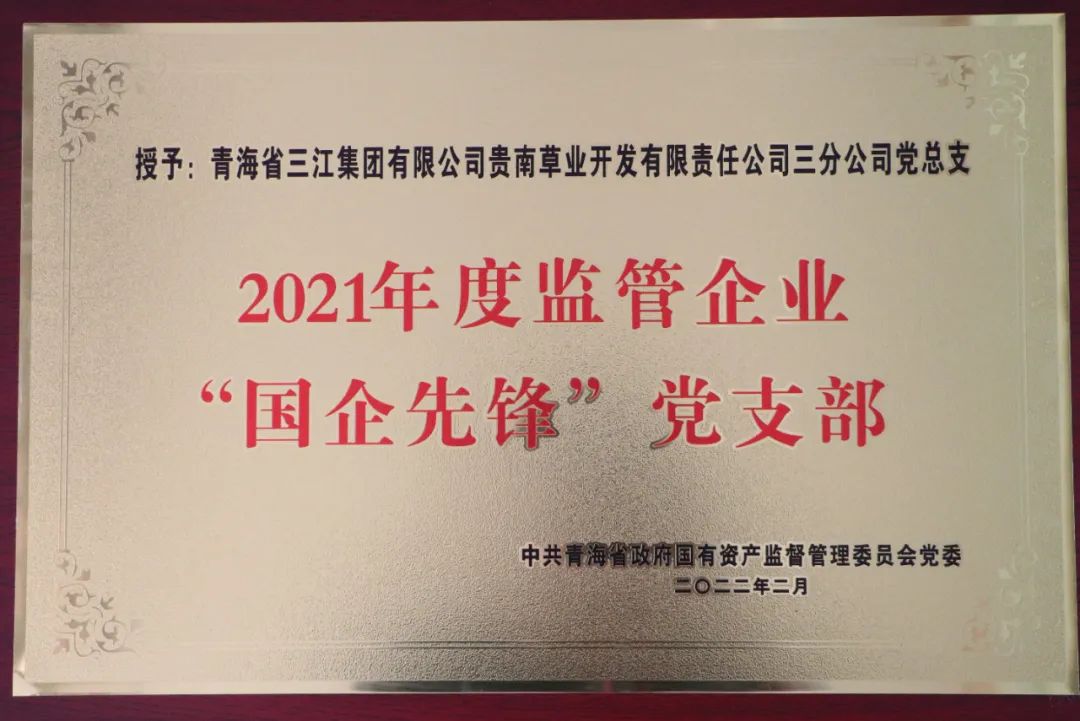 青海省三江集團(tuán)有限責(zé)任公司貴南草業(yè)公司三分公司黨總支充分發(fā)揮黨支部的戰(zhàn)斗堡壘作用和黨員的模范帶頭作用,不斷增強(qiáng)黨組織的凝聚力、號(hào)召力和戰(zhàn)斗力。在省國(guó)資委“國(guó)企先鋒”黨支部評(píng)選中,榮獲2021年度監(jiān)管企業(yè)“國(guó)企先鋒”黨支部稱號(hào)。
